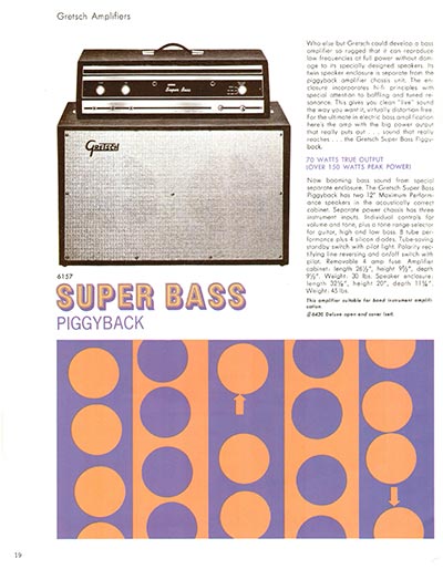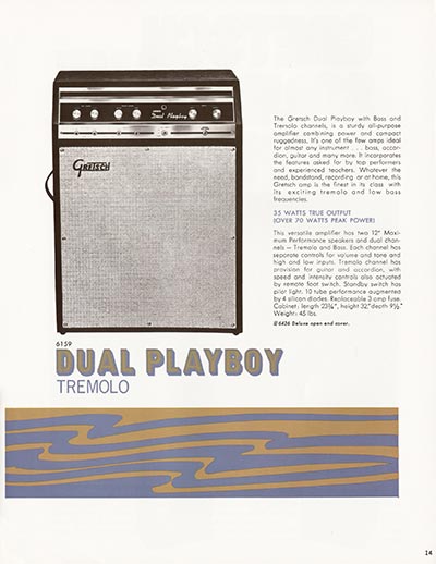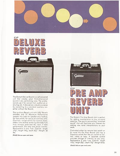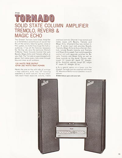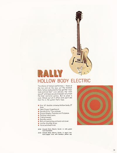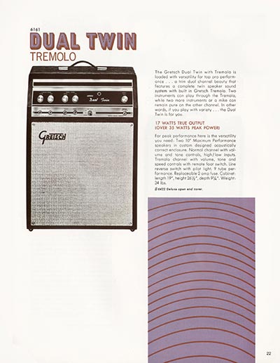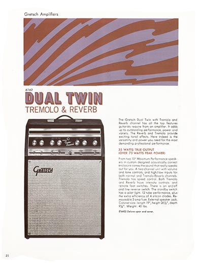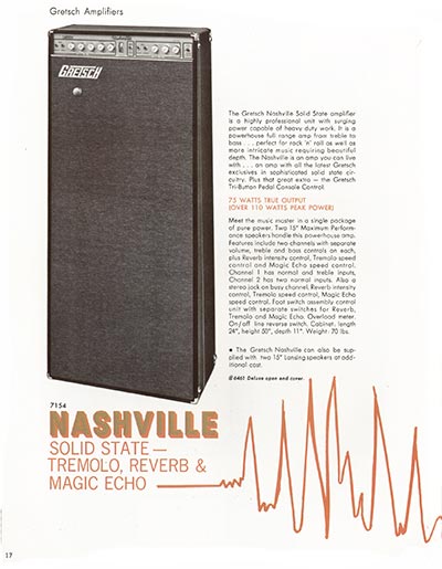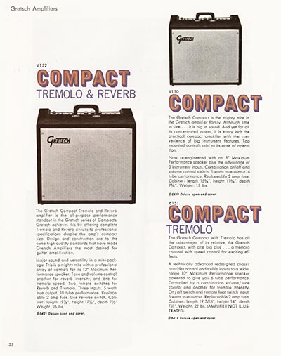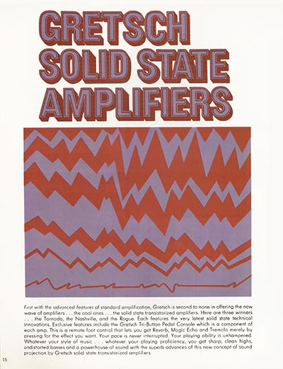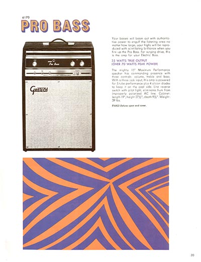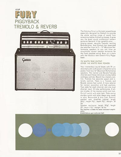 Gretsch had added several new models to their line since the previous 1965 "Spectacular Sound of the Times" catalog (#32), most notably the Gretsch Rally, 12-string and three new bass models, 6071, 6072 and 6073. There are some deletions too, most notably the Gretsch Astro Jet that was removed from the line around 1967, with other model ranges simplified. For example this brochure only offers one variant of the Gretsch Corvette, compared to three in the previous catalog. The amplifier line has changed significantly, with new solid state models, and several older combos now sold with separate head / speaker cabinet.