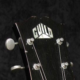The headstock logo is simply one piece of pearl that has had the gaps between letters painted. Each letter of the word GUILD and the triangle on which they sit are all one. In 1954 this was changed so that each letter was inlaid separately. These early logos give a real impression of an Art Deco New York skyline!
