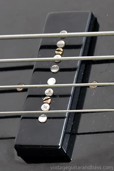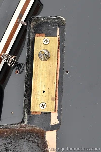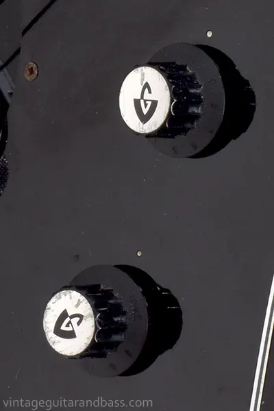 The controls are very simple: just a volume and tone control for each pickup. Control knobs are black plastic, with chrome G-logo insert. They are numbered 1-9 and marked tone / volume, although the original white lettering has totally worn away. This style control knob is more typically associated with late 1960s mid- 1970s instruments, and are only seen on the earliest B-series basses.