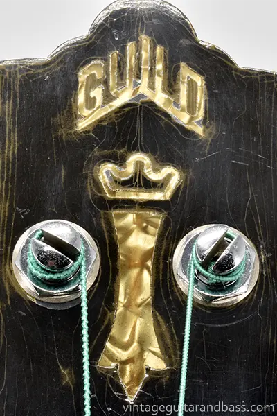Headstock front with inlays; Guild logo and Chesterfield motif.
