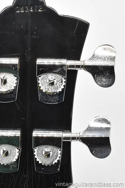 Reverse headstock detail; Schaller M4s tuning keys, with serial number stamped at the very top of the headstock. This dates this particular bass to 1977.