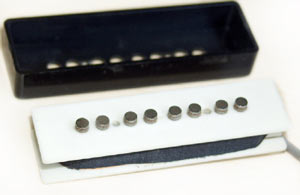 The new pickups were single coil units in black covers with two pole pieces per string - so eight pole pieces, hence the DP-8 name. The B-300s were the first models to use them, but they appeared on numerous newer Guild basses (Guild X-701 and X-702, Guild SB-202 and the Guild SB-203 ) which replaced them in the early 1980s