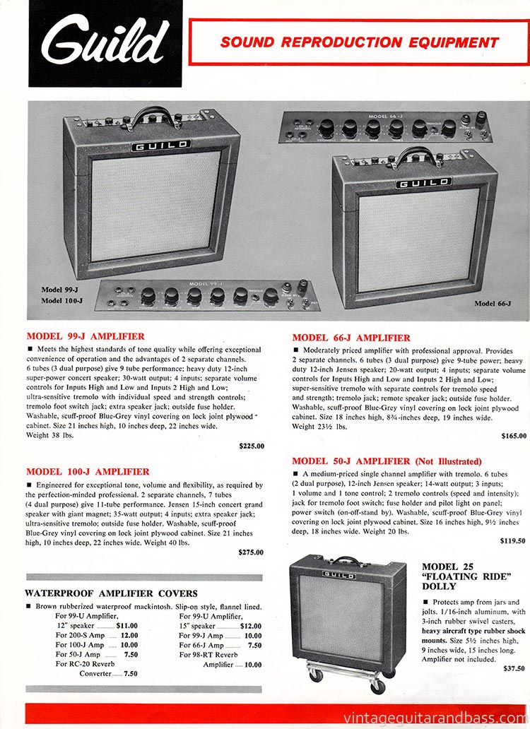 June 1963 US prices for these amplifiers were as follows: Guild 50-J $119.50, Guild 66-J $165, Guild 99-J $225 and Guild 100-J $275.