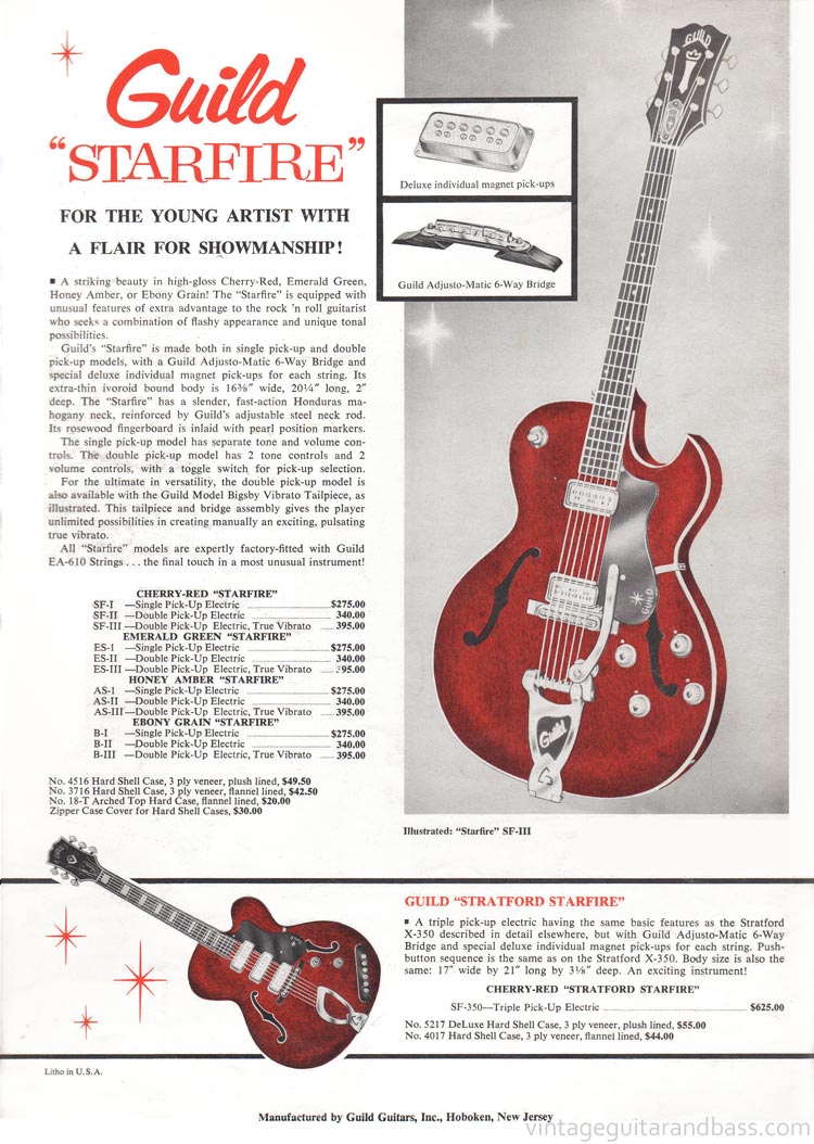 1963 US prices for these guitars were as follows: Guild Starfire I $275; Guild Starfire II $340; Guild Starfire III $395; Guild Stratford Starfire $625.
