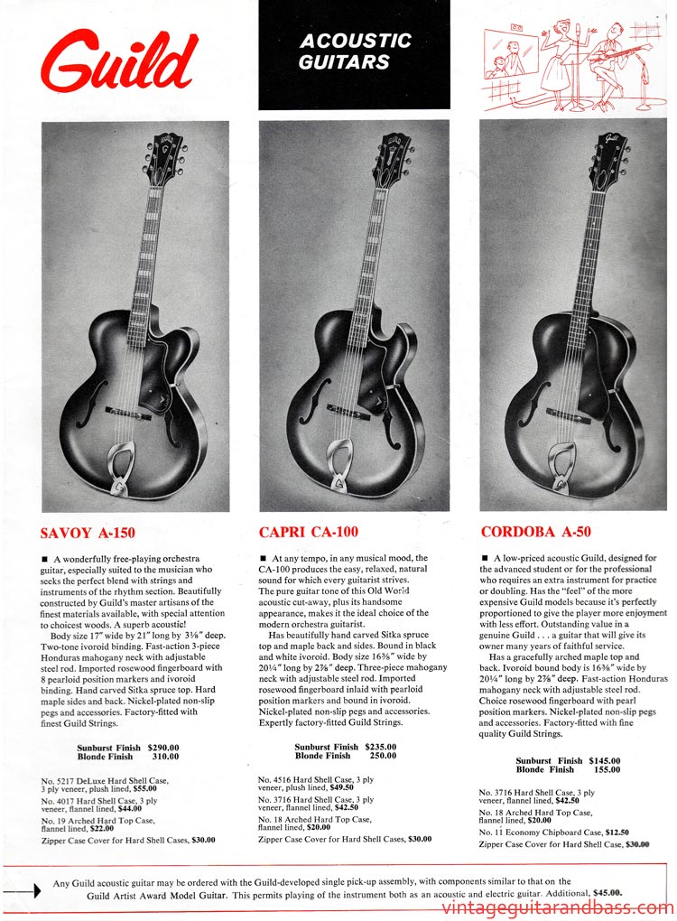 The images and descriptions appearing on this page were used by Guild in numerous catalogs through the 1960s, with only some minor changes in layout (prices, case offerings etc). Compare this page with page 11 of the 1968 catalog.