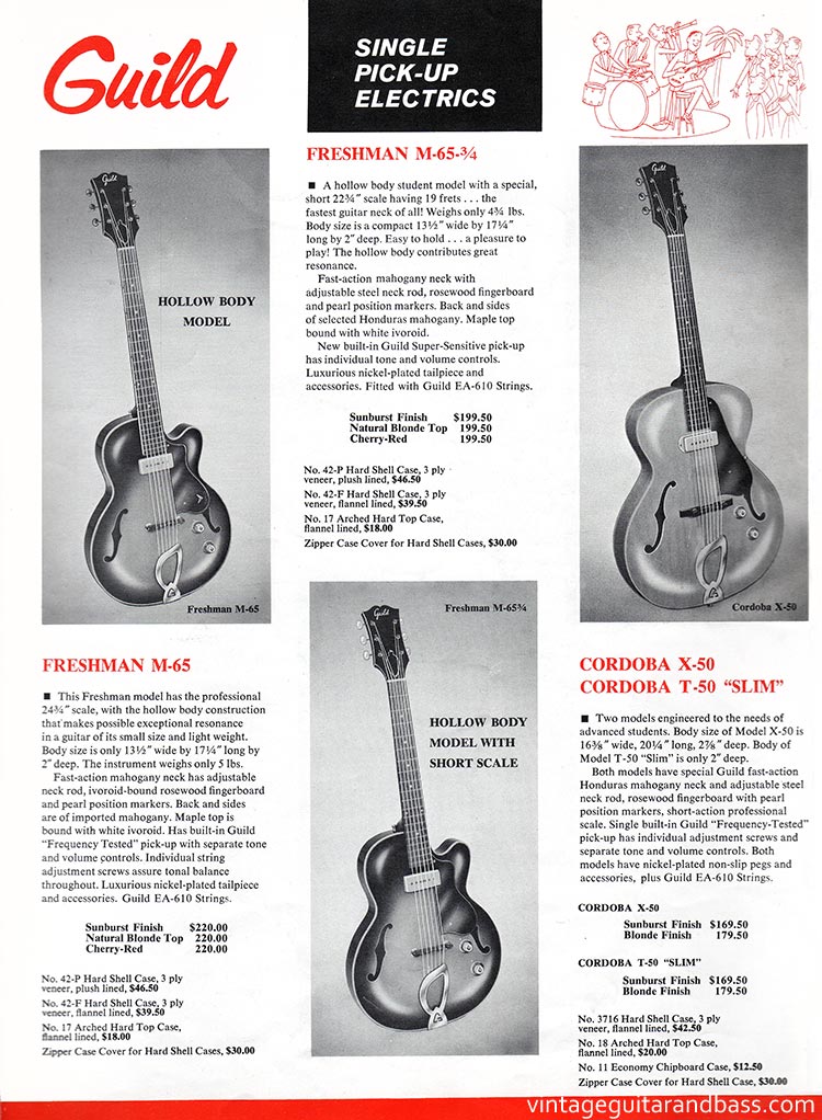 1963 US prices for these guitars were as follows: Freshman M-65 $220 (all finishes); Freshman M-65-3/4 $199.50 (all finishes), Cordoba T-50/X-50 $169.50 (Sunburst), $179.50 (Blonde)