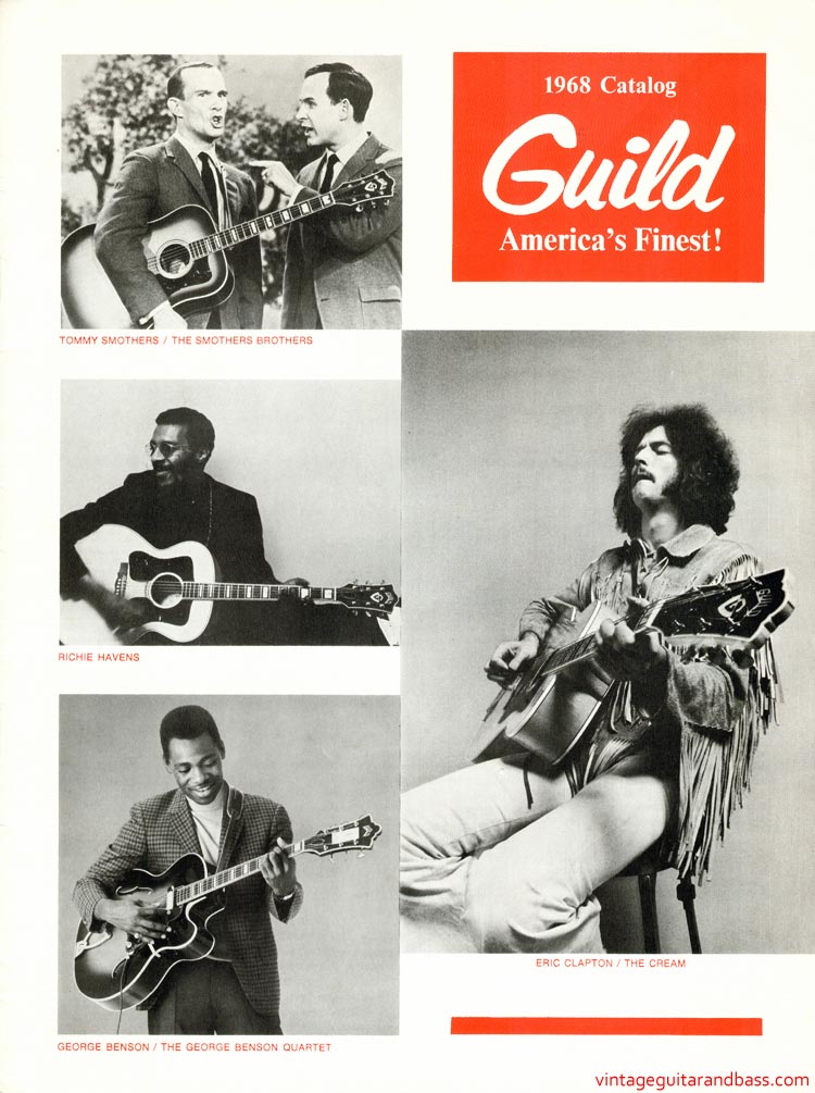 Guild 1968 catalog. Front cover featuring a number of Guild Artists: George Benson (George Benson Quartet) plays the very fine Guild Artist Award jazz guitar, whilst Tommy Smothers (Smothers Brothers), Richie Havens, and Eric Clapton are pictured with the Guild Navarre F-50 flat top acoustic.