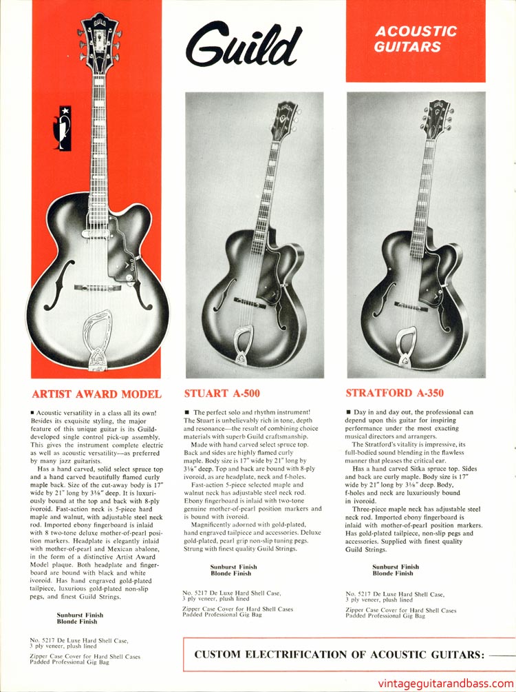 Guild 1968 catalog, page 10. Details of three Guild carved top (electric) acoustics, the very fine Guild Artist Award (with floating pickup), and the fully-acoustic Stuart A-500 and Stratford A-350. Both of these acoustics were available fitted with the Artist Award pickup at an additional $50/$55 (chrome/gold plated respectively).
