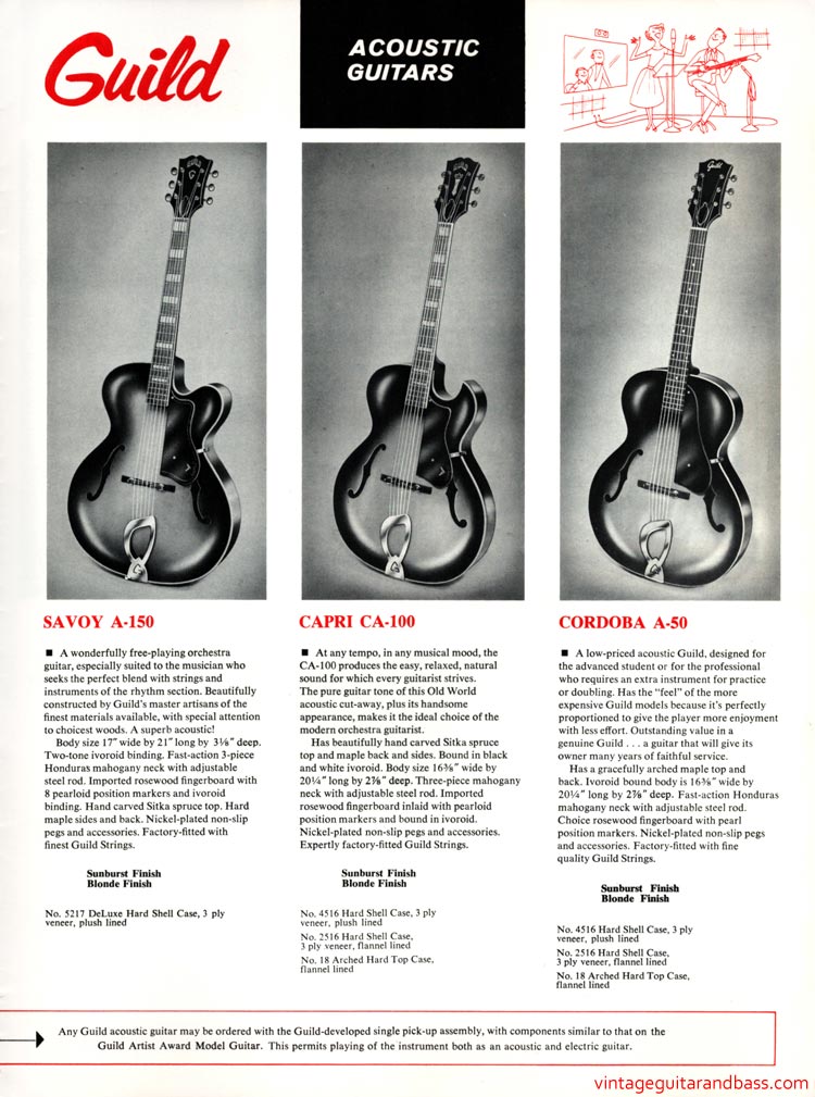Details of three mid-priced Guild arch top acoustic guitars. The non-cutaway A-50 Cordoba, the Florentine cut CA-100 Capri and the Venetian cutaway A-150 Savoy, all available in Sunburst or Blonde finish. All of these guitars were available fitted with the Artist Award pickup at an additional $50/$55 (chrome/gold plated respectively).