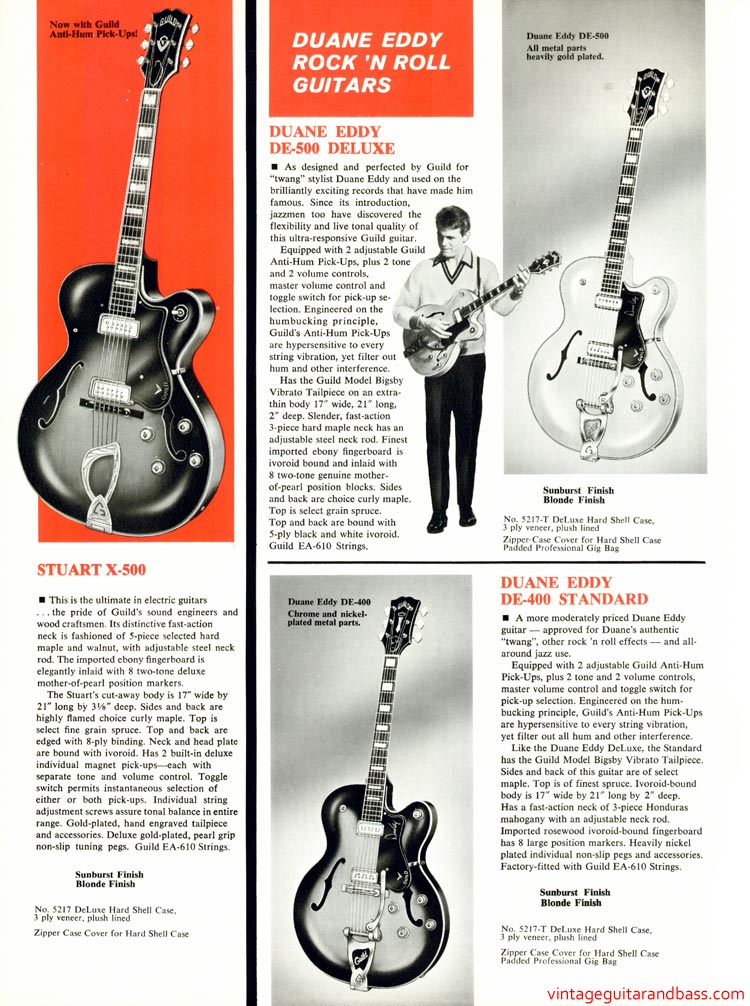 Three high end Guild archtop electric acoustic guitars: the very fine Stuart X-500, and two Duane Eddy Rock 'n Roll guitars: the Duane Eddy DE-500 Deluxe and Duane Eddy DE-400 Standard. Note this page is almost identical to the equivalent page in the 1965 and 1966 Guild catalogs.