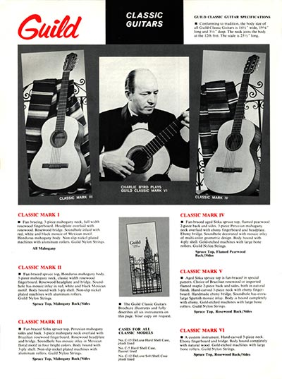 The 1968 Guild guitars catalog featured 23 distinct electric guitar models, 5 bass guitars, 5 archtop, 6 classic and 10 flat top acoustics. The following guitars are shown. Click on the images for full size versions, or click on the model names below for more about each instrument.