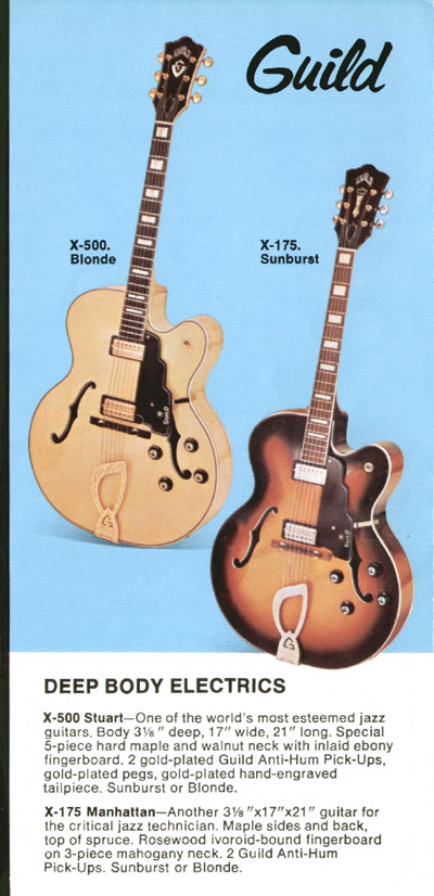 Details of two deep-body electrics, X-175 Manhattan "for the critical jazz technician", and X-500 Stuart "one of the world's most esteemed jazz guitars". These guitars had been Guild staples for years, fitted with single coil pickups in the 1950s (see a 1953 X-175, changing to humbuckers in 1963. Although the pickup itself was pictured (inset to the main image), in all catalogues up until 1968, the guitar itself still showed the single coil units. This 1969 catalog rectified that, and showed them in colour for the first time.