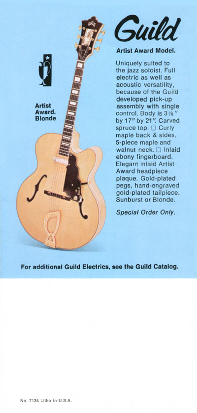 Description and image of the very fine, special-order carved-top Guild Artist Award jazz guitar. This was almost the pinnacle of Guild guitar building, and at $845/$895 sunburst/blonde, was second only to the George Barnes Acousti-Lectric at $890/$925.