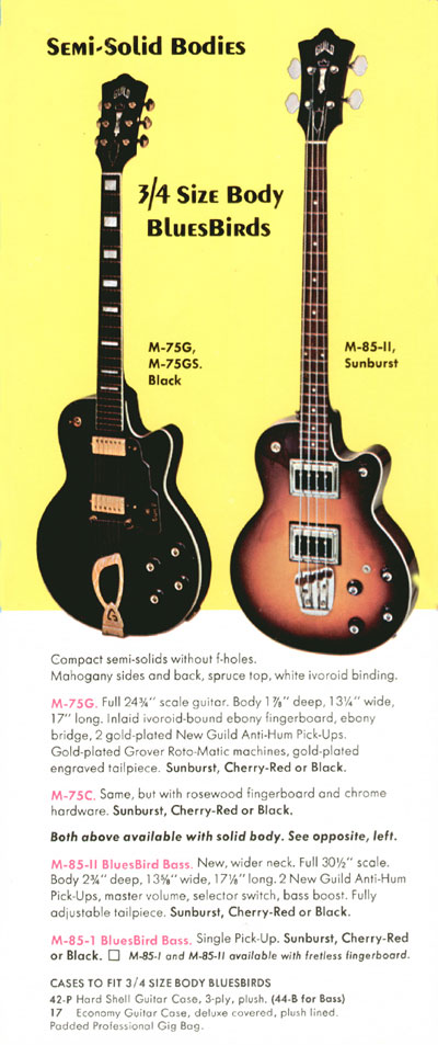 Details of three Guild Bluesbirds: the M-75 BluesBird guitar, and two basses M-85-I and M-85-II BluesBird bass