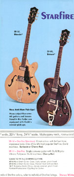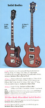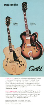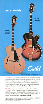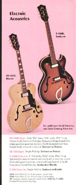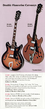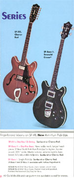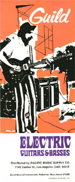 This Guild catalog is undated, though probably come from the second half of 1970. It was a folded single sheet, making a ten-sided brochure; two pages longer than the previous 1969 brochure, and containing a few new models, the double cutaway SG-style solid bodies: S-100 and JS-I and JS-II basses; the double Florentine cutaway thinline Studio ST series, and the Duane Eddy DE-500.