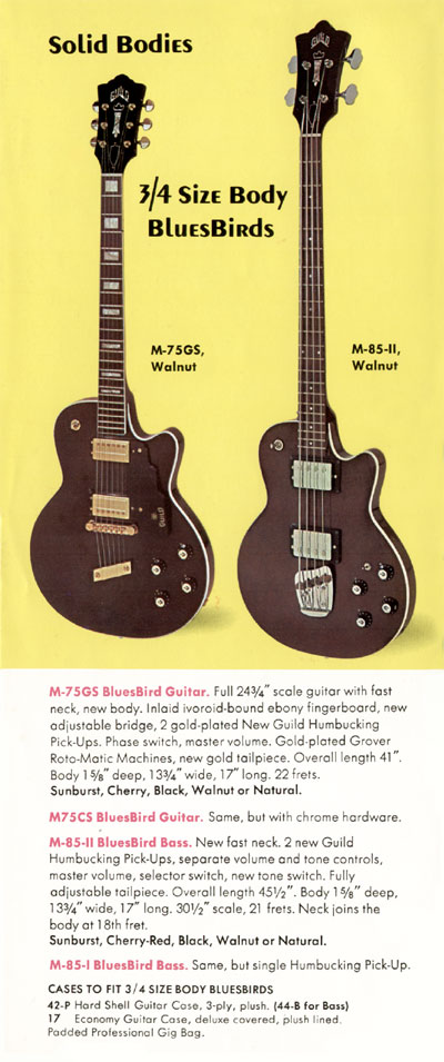 Details of three Guild Bluesbirds: the M-75 BluesBird guitar, and two basses M-85-I and M-85-II BluesBird bass