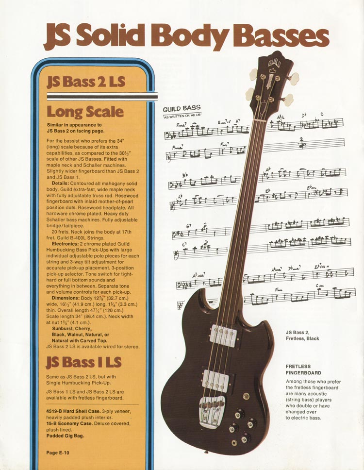 Guild 1975 catalogue. Page 10. Details of the Guild JS Bass 1 LS (single pickup) and JS Bass 2 LS (dual pickup) longscale (34") models. The JS bass guitars were available short scale - see the next page. A fretless fingerboard was available as an option - as shown on the page here.
