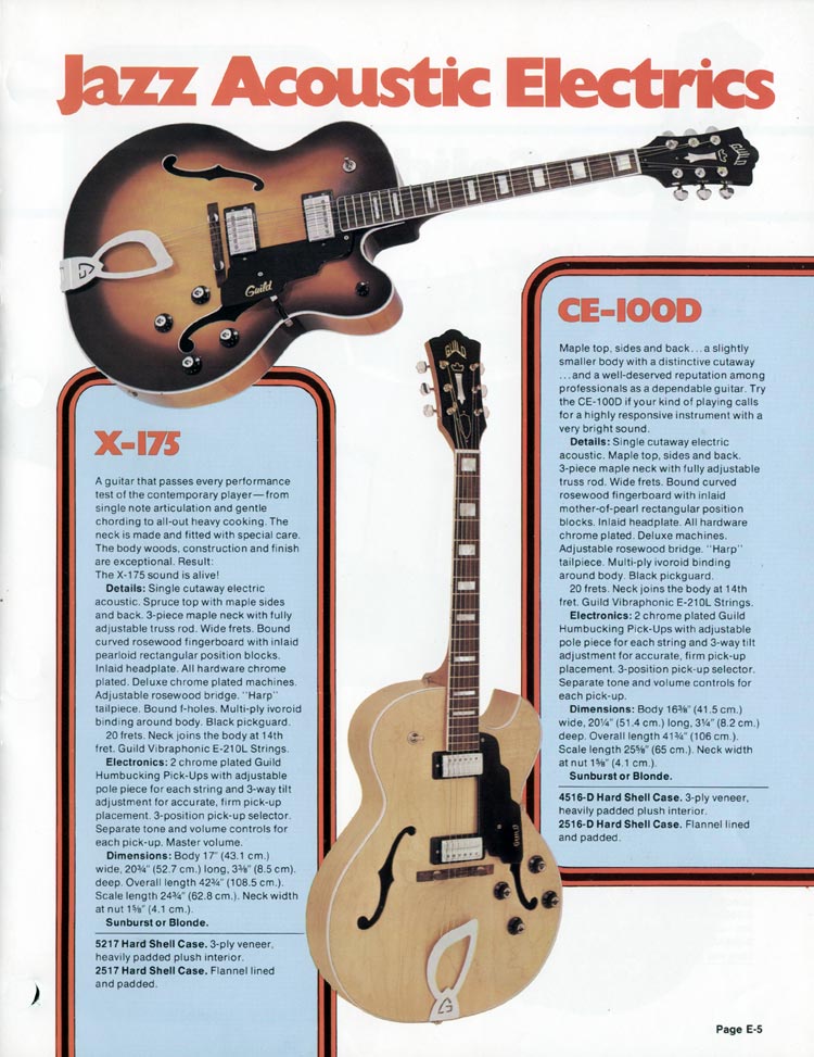 Guild 1978 catalog page 5. Once again this page shows two more jazz acoustic electric guitars, the X-175 and the CE-100D. Although the CE-100D pictured has a (slightly darker) mahogany neck, it is listed here as having a three-piece maple neck for the first time. As described in the 1975 Guild catalogue, the neck is still long (25 5/8") scale, although this was back to 24 3/4" before the final appearance in the 1982 Guild catalog. This page uses the same illustrations as page 3 of the 1975 Guild catalog, with slightly modified description.