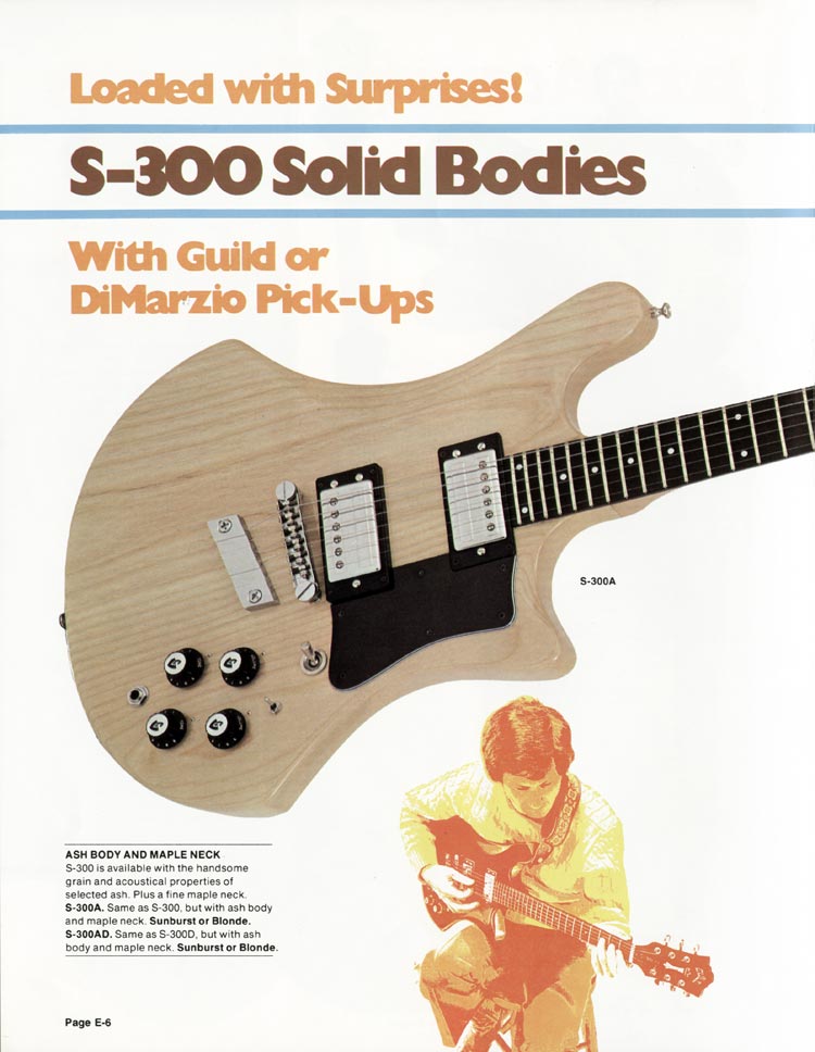 Guild 1978 catalog page 6. This is a double page spread with page 7, for the Guild S-300 guitar. This page pictures the S-300A with its natural-finish ash body and maple neck. (The S-300 has a mahogany body and neck). Both versions have an ebony fingerboard. Mention is also made of the Guild S-300AD, which is the ash version loaded with DiMarzio pickups (DiMarzio PAF at the neck, DiMarzio Super Distortion at the bridge).