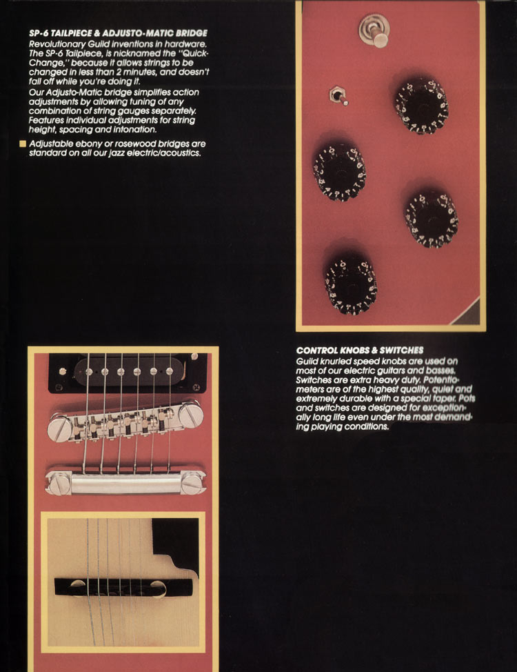 This page continues describing some of the features common to numerous Guild guitars: SP-6 tailpiece / Adjusto-matic bridge / Knurled control knobs.