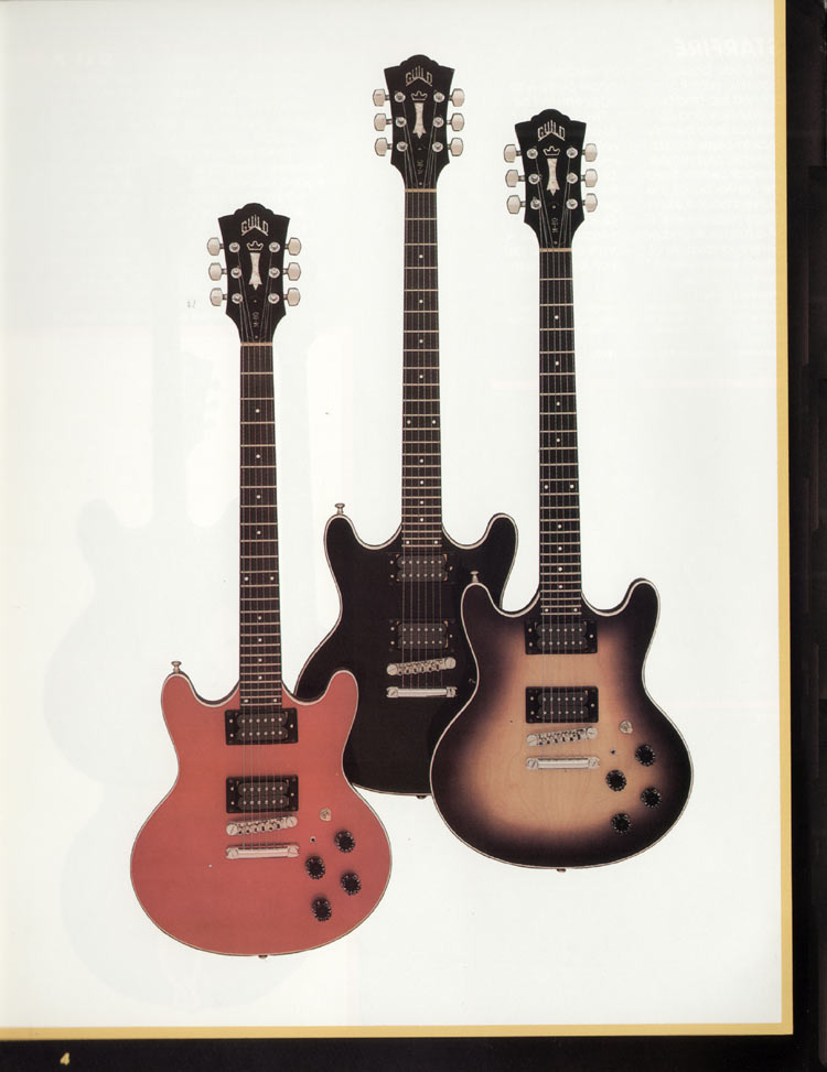 This page shows three examples of the Guild M-80, in Sunburst, Black, and Candy Apple Red finishes. This corresponding description appears on page 7: