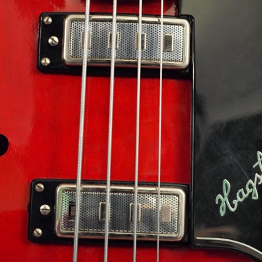 This bass, in Cherry Red finish, has a birch front, back, sides and neck. It is from the third and final batch of Hagstrom Concord (C1) basses and most likely dates from 1967, or very early 1968. The 1968 Hagstrom catalogue gives it a list price of $285