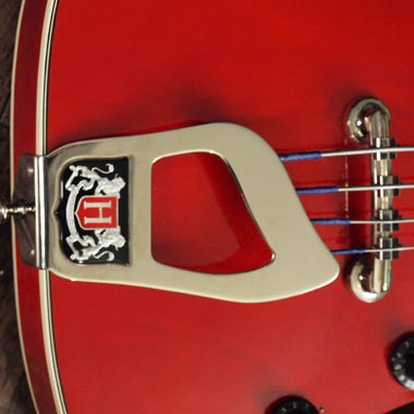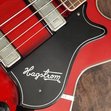 "True" sound... with exceptionally wide tonal range created by special sound posts beneath the bridge. The sound is reproduced acoustically in the body, then electrically projected by the super-sensitive Hagstrom pickups. Lightweight, graceful, slim, double cutaway design. 16 inch arched body. Handsomely polished finishes. Heavy celluloid bound edges. Hagstrom's deluxe Crest tailpiece. Fast action neck with patented "H" expander rod. Celluloid bound rosewood fingerboard with pearl inlaid dots and visual side markers. 2 ultra-sensitive adjustable pickups each with separate volume and tone controls. 3-way toggle switch, for treble or bass pick-up, or both. Micromatic adjustable bridge. Individually enclosed tuning units.