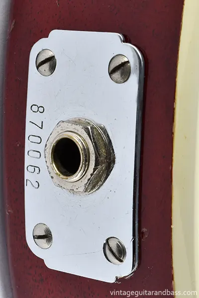 1973 Hagstrom Swede Bass output jack with serial number 870062. 870 is the batch number, whilst 062 is the instrument number in that batch. This was actually the smallest batch of Swedes with just 100 instruments.