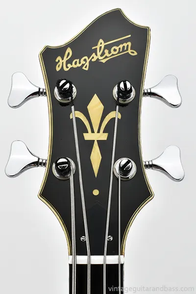 1973 Hagstrom Swede Bass headstock front, with inlaid Hagstrom logo and fleur-de-lis motif. The front has three-ply white/black/white binding.