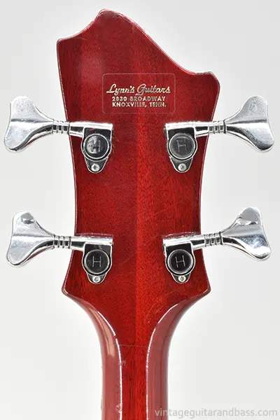 1973 Hagstrom Swede Bass headstock reverse, with Hagstrom-branded Schaller M4 tuning keys. The decal on the reverse was applied by the original vendor, Lynn's Guitars in Knoxville, Tennessee.