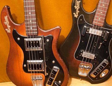 Two Hagstrom Coronado bass guitars: left, a 1964 Coronado, from the first batch produced, fitted with Bi-Sonic pickups; right a 1966 Coronado IV with small single coil pickups