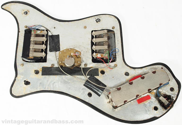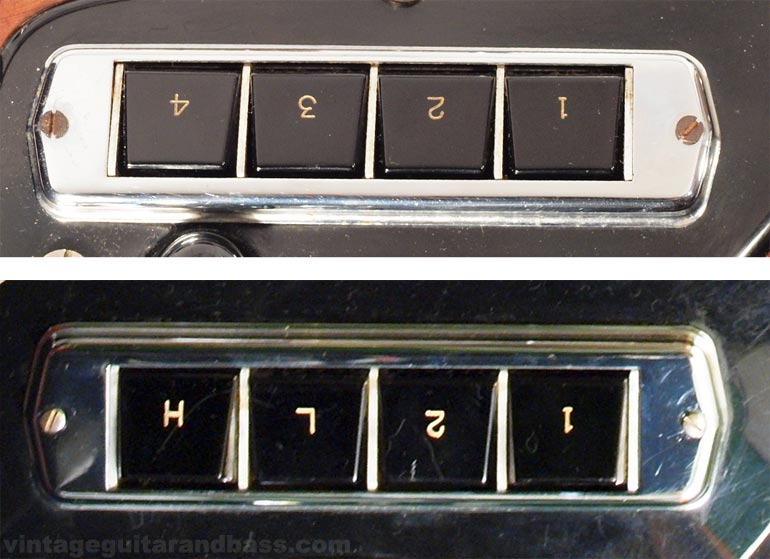 The basic Coronado design remained the same across the course of production, but there were subtle changes across the batches produced. Most notably, the Bi-Sonic pickups were replaced with a smaller unit; still single coil but much more traditional in design. Hagstrom, however continued to call them 'Bi-Sonic' in their catalogues. but also: switches: Initially numbered 1-4, later 1-2, L, H; output jack: Initially enclosed by the scratchplate, later, a separate screw-in metal version (from batch 658). scratchplate: initially single-ply black plastic held in place with larger slot head bolts; later (1966) three-ply with typical screw mounting. finger rest: This changed from a long bar below the pickups to a tall metal post above and below the neck pickup. truss rod cover: the aluminium 'Kings Neck' truss rod cover only appeared up until 1965, with later headstocks having a string bar and no access to the truss cavity from the headstock end.