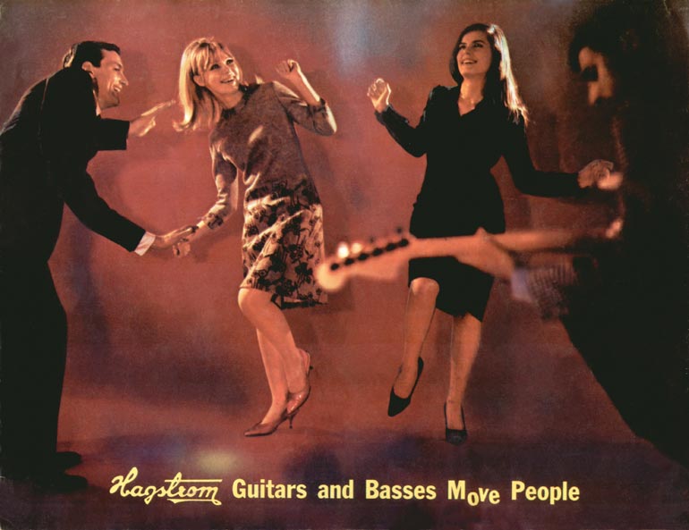 Hagstrom 1966 guitar catalog. Front cover. As the catalog name 'Hagstrom guitars and basses move people' suggests, the theme of this publication is very much people dancing to music played on Hagstrom instruments. Images of dancers appear throughout the catalog, most notably on the front cover.