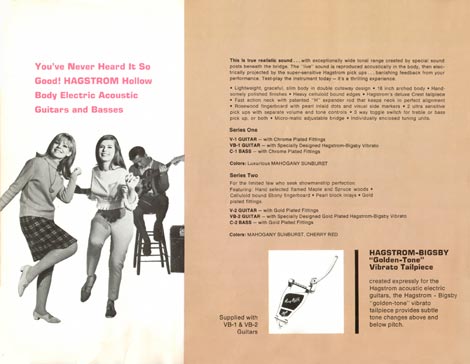 Hagstrom 1966 guitar catalog, page 14. Left hand side of double page spread - details of the semi-acoustic Viking guitar and Concord bass. This catalog was produced by US distributor Merson for the US market. The names Viking and Concord are not actually used here, just the initials, V-1, V-2, C-1, C-2 etc. There are four versions of the Viking described here: the V-1 (chrome hardware, dot inlays) and V-2 (gold hadware, block inlays); but also the same guitars with special Bigsby "Golden-tone" vibrato: VB-1 and VB-2. The bass models are the C-1 (chrome hardware, dot inlays) and C-2 (gold hadware, block inlays). 1966 list prices in the United States were: V-1 $250; VB-1 $299.50; C-1 bass $260; V-2 $425; VB-2 $499.50; C-2 bass $435.