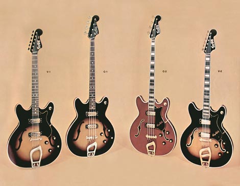 Hagstrom 1966 guitar catalog, page 15. Right hand side of double page spread demonstrating Hagstrom's semi-acoustic guitars and basses, the V-1 / V-2 guitar and C-1 / C-2 bass. These models were known as the Viking and Concord respectively, beyond the US. Shown, from left to right: Hagstrom Viking V-1, Concord C-1, Concord C-2 (Cherry finish) and Viking V-2. Although a Bigsby vibrato was available as an option, all of the guitars shown are equipped with the Hagstrom harp tailpiece.