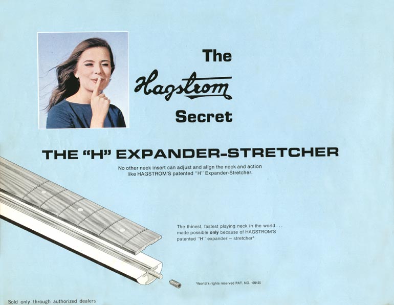1966 Hagstrom guitar catalog, page 2. It's true that vintage Hagstrom guitars benefitted from low, easy-playing action; a result of their flat necks - in turn resulting from the H-shaped truss rod. This page describes this Hagstrom H expander-stretcher neck insert that gives the "thinest fastest playing necks in the world".
