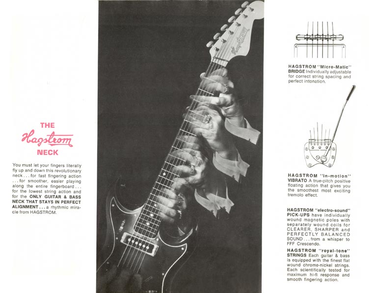 Hagstrom guitar 1966 guitar catalog, page 3. This page highlights some of the great features of mid-1960s Hagstrom guitars. Hagstrom's were pretty playable guitars with good necks - largely due to the H expander-stretcher truss rod, as detailed on the previous page. The central image below demonstrates the "world's fastest playing neck", and was actually the cover image of the previous Merson-produced Hagstrom catalog, from earlier in 1966. The text also describes the Hagstrom micro-matic bridge, in-motion vibrato, electro-sound pickups, and royal-tone strings.