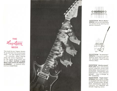 You must let your fingers literally fly up and down this revolutionary neck ...for fast fingering action ... for smoother, easier playing along the entire fingerboard ...for the lowest string action and for the ONLY GUITAR AND BASS NECK THAT STAYS IN PERFECT ALIGNMENT ... a rhythmic miracle from HAGSTROM