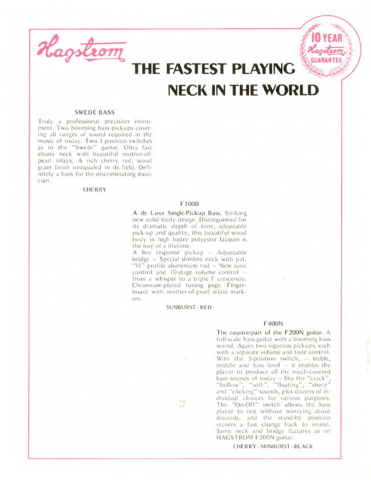 Hagstrom guitar 1972 guitar catalog. Page 4. Details of three Hagstrom basses: the Swede, F100B, and F400N basses.