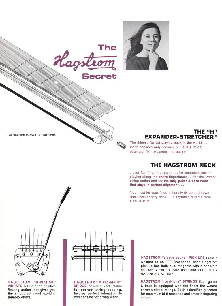 1966 Hagstrom "world's fastest playing neck" guitar catalog, page 2. The Hagstrom 'Secret', was, of course, their patented "H" expander-stretcher truss rod that allowed for a thin neck with low action.