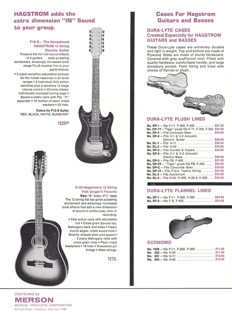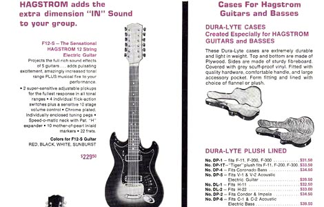 Hagstrom "world's fastest playing neck" 1966 guitar catalog, page 8. The back page of the brochure details two new twelve string models. This is the first US Hagstrom catalog to show the F-12S and H33 models.