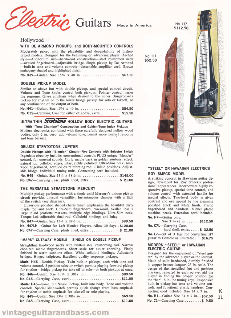 The Hollywood series consisted of two guitars: the H39 (one pickup) and H41 (two pickups). The stratotone series was about to be phased out (the 1965 catalog was the final appearance of these guitars), but at this stage consisted of the H45 and H46 Mars, H47 Mercury and H49 Jupiter.