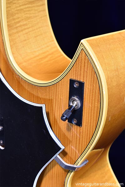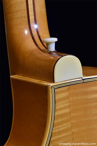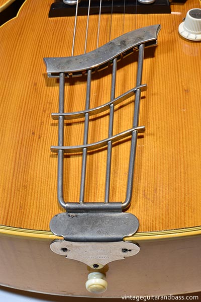 The lyre-style tailpiece was a common feature on Hofner electric-acoustic guitars, and was inherited from earlier versions of the President.