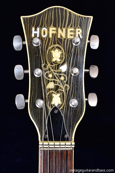 This headstock has significant lacquer checking / crazing, though not enough to obscure the inlaid pearl vine motif and HOFNER name.