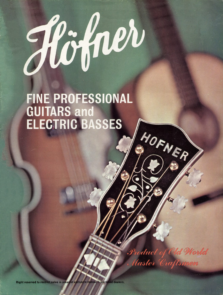 In the very early 1960s, Hofner hollow-body guitars had a great reputation, but by the mid-sixties, the most famous Hofner in the world was the violin bass played by Beatle Paul McCartney. It is, therefore, no surprise to see the violin bass on the cover of the 1967 catalog, behind the headstock of what would appear to be the top-of-the-line 470SE2 carved top electric acoustic.