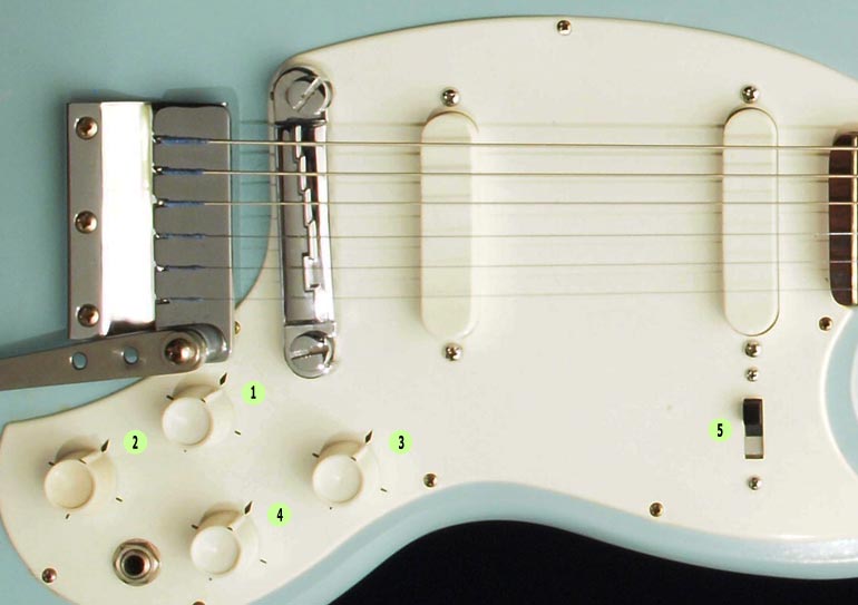 The controls for the dual-pickup Kalamazoo KG2 and KG2A are as follows: