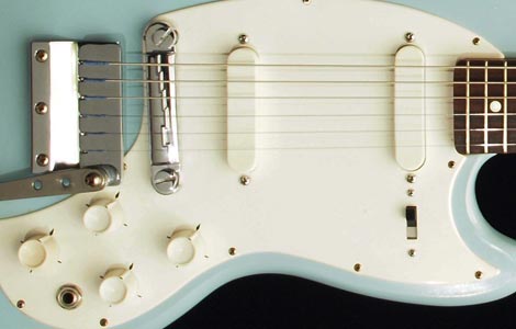 [5] Three way pickup selector: up: neck; middle: both pickups; down: bridge