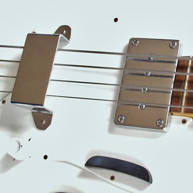 This bass used some standard Gibson components; a typical EB series humbucker right up at the neck, as used in the EB0, EB2, EB3, Melody Maker bass and Epiphone Newport. This pickup in this position, has more affect on the sound than anything else. This bass does sound quite a lot like an EB0 (check out the Kalamazoo KB soundclips here). Tuning keys are the Japanese-made closed keys that were also used on the Melody Maker bass and a few EB basses. The bar bridge had been in use on all EB bass models, but around 1966/67 this was replaced by the two-point intonatable bridge. From this point, the KB bass was the only one using these bridges - likewise the only one using the old-style (and position) chrome handrest.