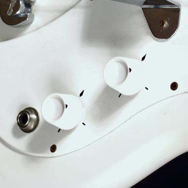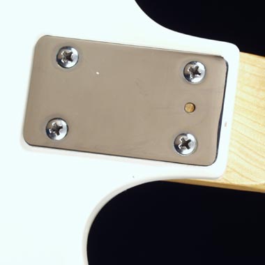 The scratchplate was almost identical (except some minor screw hole differences) to the Melody Maker bass, but the fingerrest was not rosewood as on all Gibsons, but actually plastic. The body material is not specified in Kalamazoo literature, but is supposedly a wood-laminate of one or more unspecified species, produced by a composite-wood manufacturer in Wisconsin. There were three colours: Flame Red, Glacier White, and Las Vegas Blue - the same three colours of the Fender Mustang of this period. These were not the expensive nitrocellulose finishes applied to Gibsons, but again catalogue descriptions are not specific, presumably polyurethane.