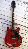 Semi-acoustic slim line concert model. Double-cutaway 'cello style, sunburst shaded body and neck. Heavy black and white ivorine edges, rosewood ivorine bound finger board, with pearl position markers, steel truss rod, adjustable bridge, chromium-plated fully enclosed all metal machine heads. Two high response adjustable pick-ups with tone and the volume controls, over-riding rhythm and solo switch, combined tailpiece and tremolo arm. Superb high gloss finish.